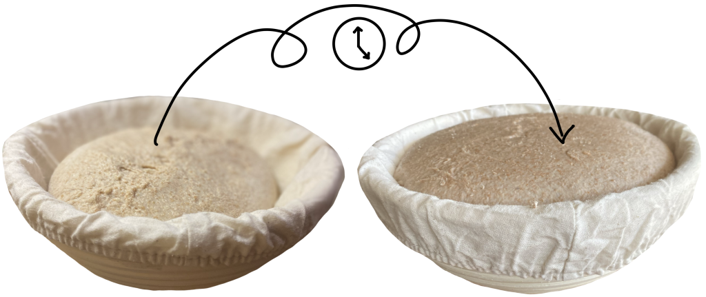 4. Na de bulkrijs is het tijd om het deeg te vormen. Leg het deeg op een met rijstmeel bestoven werkvlak en trek het voorzichtig(!) iets plat. Rol het deeg op en vorm een strakke bal. Leg het gevormde brood met de gladde kant naar beneden in een met rijstmeel bestrooid rijsmandje. Rijstmeel voorkomt plakken én brandt niet aan wanneer je je brood afbakt in de oven. Laat het deeg, afgedekt met een theedoek, een nacht in de koelkast rijzen. Dit is de koude rijs.